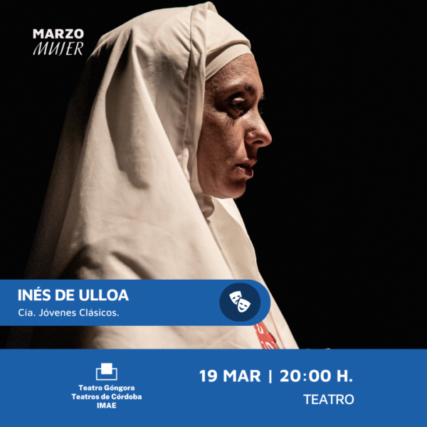 El Ciclo Mujer, es la propuesta un año más del Instituto Municipal de Artes Escénicas (IMAE) para conmemorar el Día Internacional de la Mujer. Tres espectáculos con grandes historias de mujeres como protagonistas vertebran la programación de esta semana. Inés de Ulloa, obra escrita por Sergio Rubio, a partir de las obras de Zorrilla y Claramonte, inaugura este ciclo el 19 de marzo en el Teatro Góngora. Inés da la voz a la mujer por encima del mito de Don Juan, para contar su verdad ante un público de todas las edades, ya que, además de la función de las 20 h, se realizará una función para centros de educación secundaria ese mismo día a las 11h.